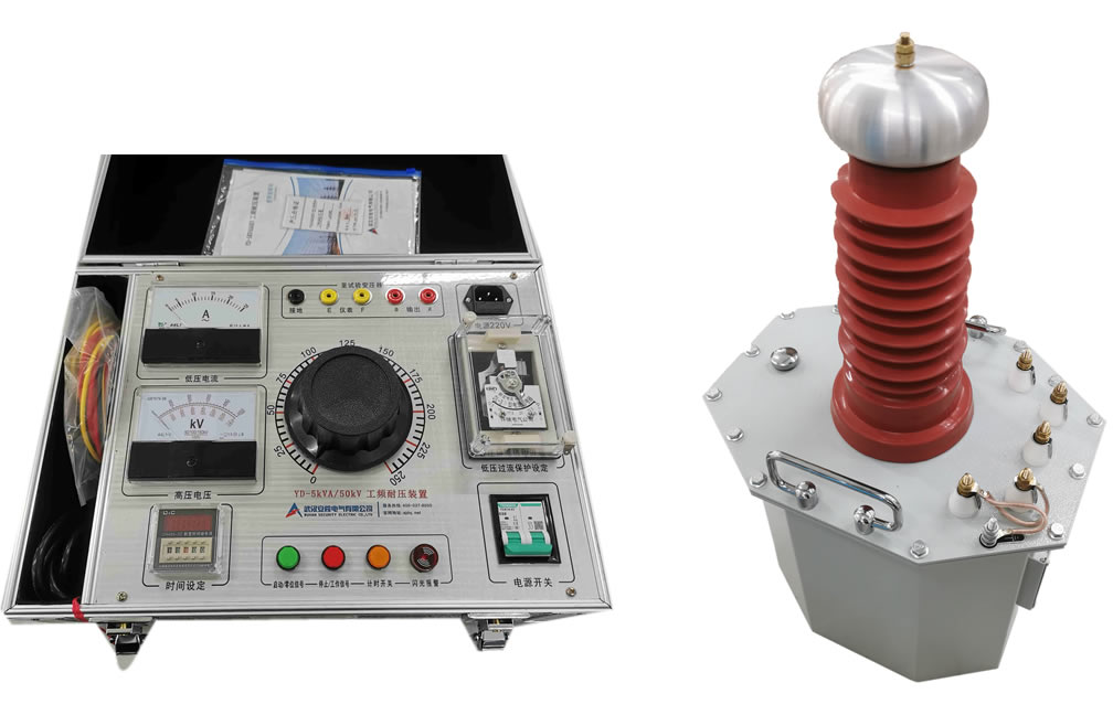 YD-5KVA/50KV工頻耐壓裝置(下稱試變)又稱升壓器,它是發(fā)電站、供配電系統(tǒng)及科研單位等廣大用戶的基本試驗(yàn)設(shè)備。用于對(duì)各種電器產(chǎn)品、電氣設(shè)備、絕緣材料等進(jìn)行規(guī)定電壓下的絕緣強(qiáng)度試驗(yàn),考核產(chǎn)品的絕緣水平,發(fā)現(xiàn)被試品的絕緣缺陷,衡量承受過(guò)電壓的能力。